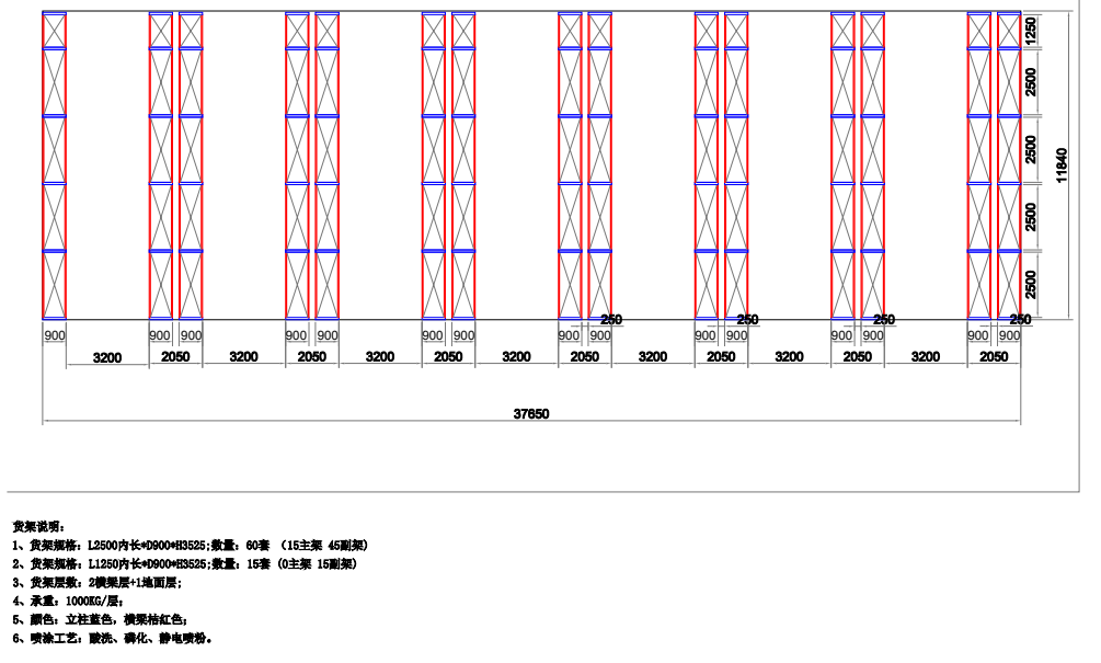 1、貨架規(guī)格:L2500*D900*H3525 數(shù)量:60套 (15主45副)