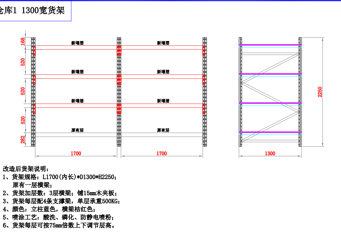 首先當(dāng)我們預(yù)留空間時(shí),我們需要考慮很多因素。其中之一是貨架每層的高度。通常是根據(jù)貨物的高度來設(shè)計(jì)的。考慮到整個(gè)貨架的安全性,我們會(huì)根據(jù)貨物的高度留出更多的空間,這部分空間就是安全空間。因?yàn)槿绻麅?chǔ)物架的高度與貨物的高度相同,叉車將非常不方便取貨。它可能會(huì)與貨架碰撞和摩擦。如果你留出一定的空間,這個(gè)問題就可以解決.定制貨架尺寸為:長(zhǎng)1700*寬1300*高2250 數(shù)量:4套 原有一層橫梁 2、貨架加層數(shù):3層 鋪15mm木夾板 貨架每層配4條支撐梁,單層承重500KG 每層可按75mm調(diào)節(jié)高度