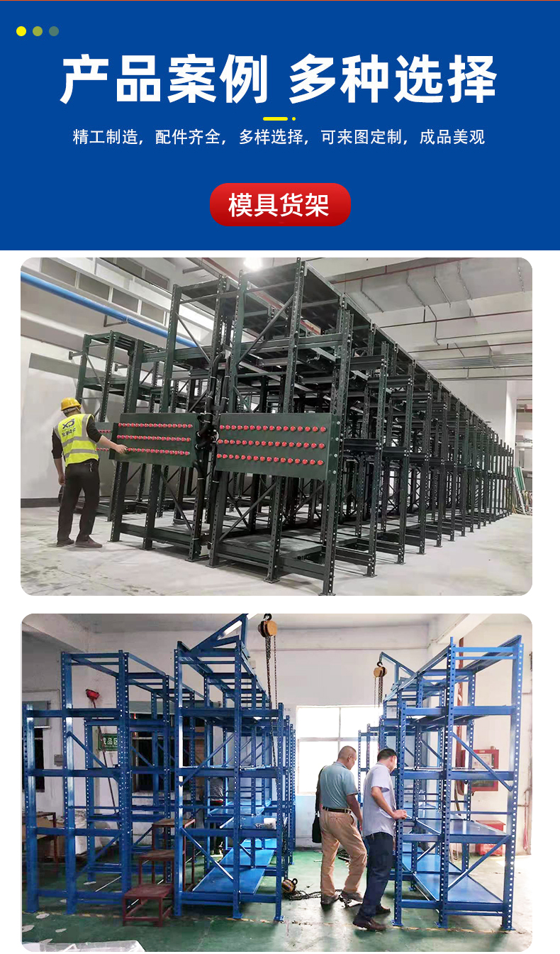 模具貨架的優(yōu)點就是,結(jié)構(gòu)簡單便于運輸、安裝和拆卸。對于場地空間可以有效的節(jié)約。采用軸承組合,滑動平穩(wěn),并附有獨立吊模裝置。