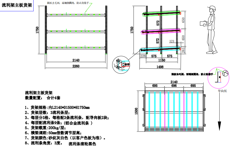 上圖是我們司給聯(lián)想公司生產(chǎn)的流利式貨架,貨架參數(shù)是:L2140*W1500*H1750 三層流利條 每層分3格、每層配3條流利條,配導向板2塊、每層配9條流利條(鋁合金流利條)每層載重200KG 橫梁調(diào)距是50mm倍數(shù)調(diào)節(jié)層高。貨架顏色:以客戶樣本為準 流利條的角度為3度,流利條滾輪黑色.