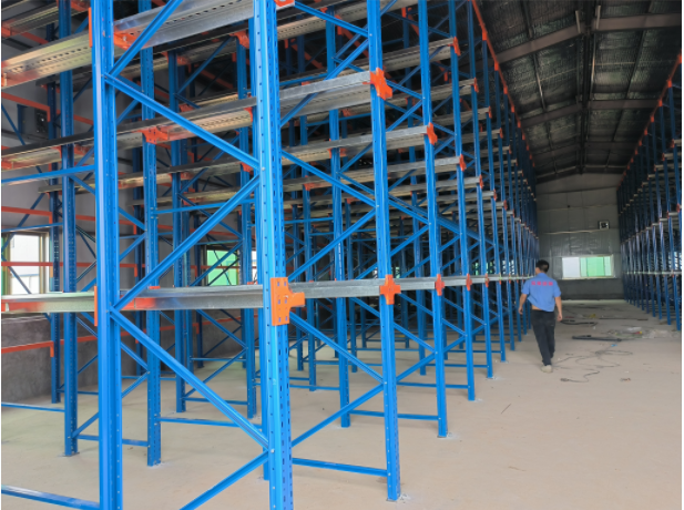 首先依據(jù)客戶倉庫的高度規(guī)劃貫通式貨架,貨架高度達(dá)到了庫房的全高,這樣可以做成了4層貨架,把貨物放置在托盤上,可直接運(yùn)用叉車進(jìn)出貨品。在貫通式貨架上會(huì)安裝上導(dǎo)軌,可降低了貨物和貨架的損壞率。